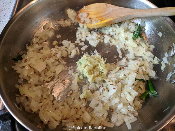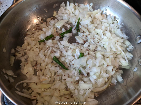 Now comes in minced onions and green chili. Saute them over medium flame with a pinch of salt. This process is the key to a creamy gravy… so a little patience required. Saute the onions till lightly golden & browned.