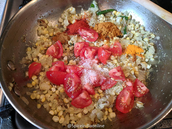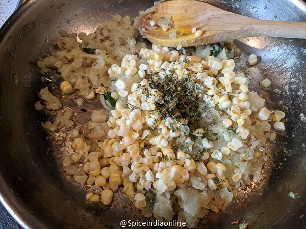 Add in the fresh corn kernels along with kasuri methi leaves (dry fenugreek leaves) and saute well.