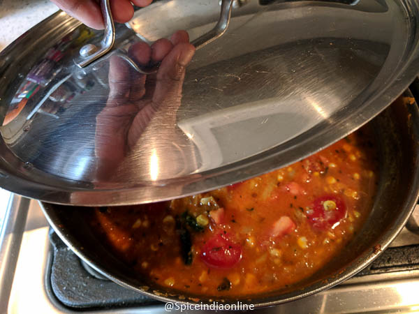 Now cover with ta tight lid and cook for 10 minutes…. shhhhh, do not disturb! The corn needs to cook a bit, don’t worry it will not turn mushy! Meanwhile blend the milk, cashew and poppy seeds to a thin consistency and keep it ready.