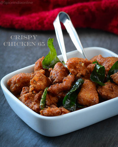 Crispy Chicken 65 – have you wondered how those restaurant chicken 65 stays so crisp even after 30 minutes?… all you regular home made 65 will be crisp the moment you get them out of that oil and slowly goes soft. 😳 This one here is exclusive from our page will keep them crisp and crunchy for little longer. Secret?? baking soda! & absolutely no yogurt in this recipe. There are other few things that you need to follow to make this crunch crunch Chicken 65…., read notes before you make. Here is our home style version Chicken 65 … if you in the mood for that or there is Hyderabad Chicken 65 which is slightly different where you season the chicken after deep frying… you name it we have it for you!