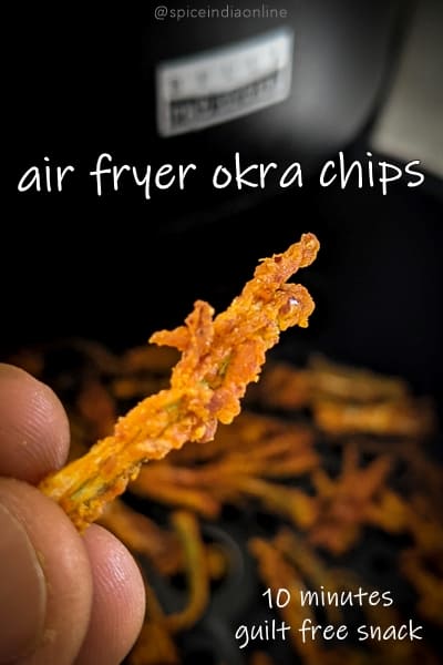 This crispy, crunchy okra chips can be enjoyed as a snack with a cup of tea or can be had as a side for rice and dal. This air fried version is very easy to make and also is healthy. Now we can enjoy this snack guilt free!