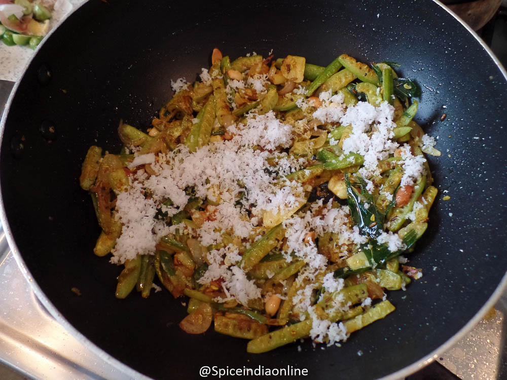 Once done, switch off and add in the grated coconut and stir fry while its still warm. Serve hot as a side for sambar, rasam or curd rice.