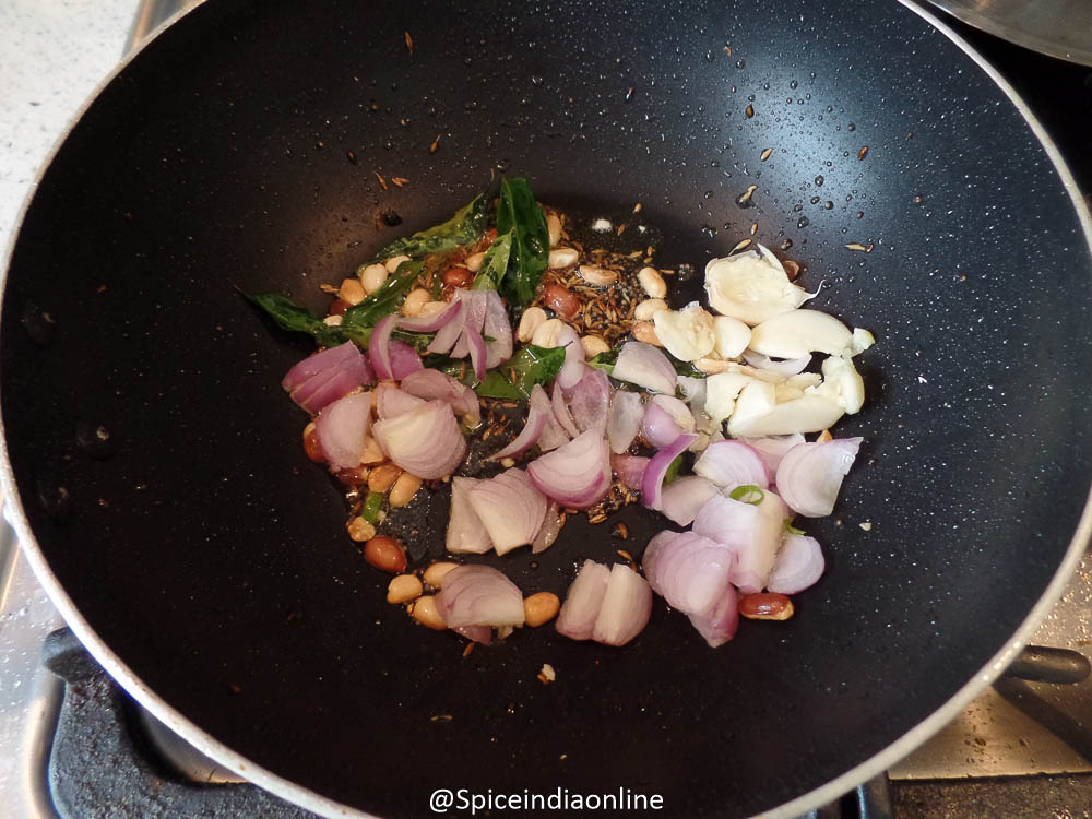 Add the seasoning after you fry the peanuts- splutter mustard seeds, split black gram, cumin seeds and curry leaves.