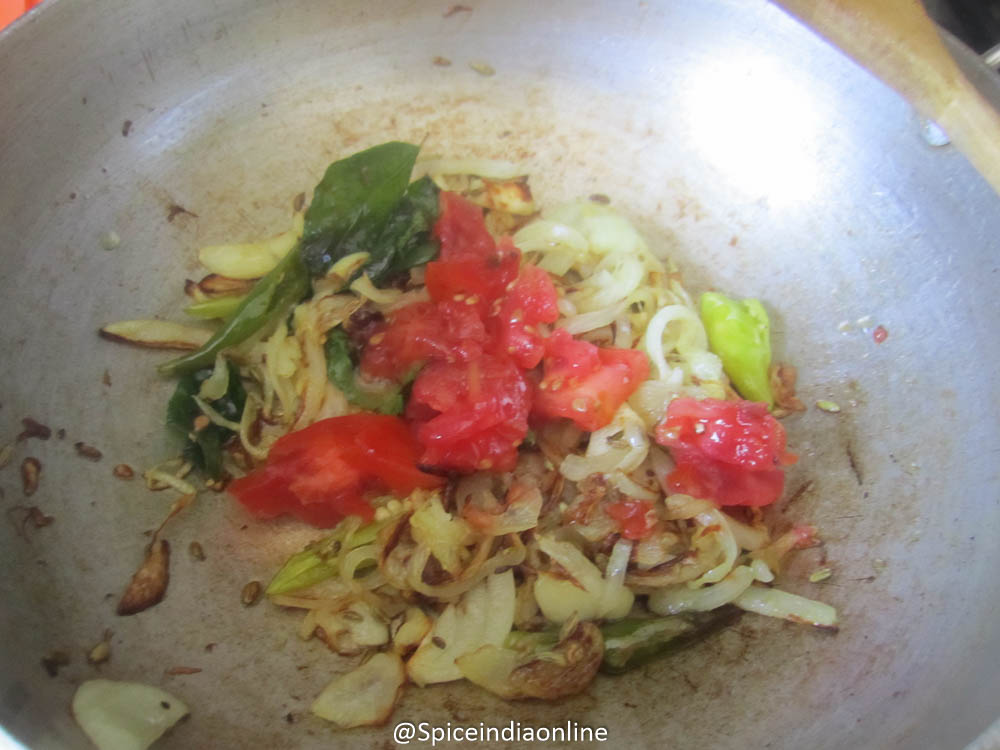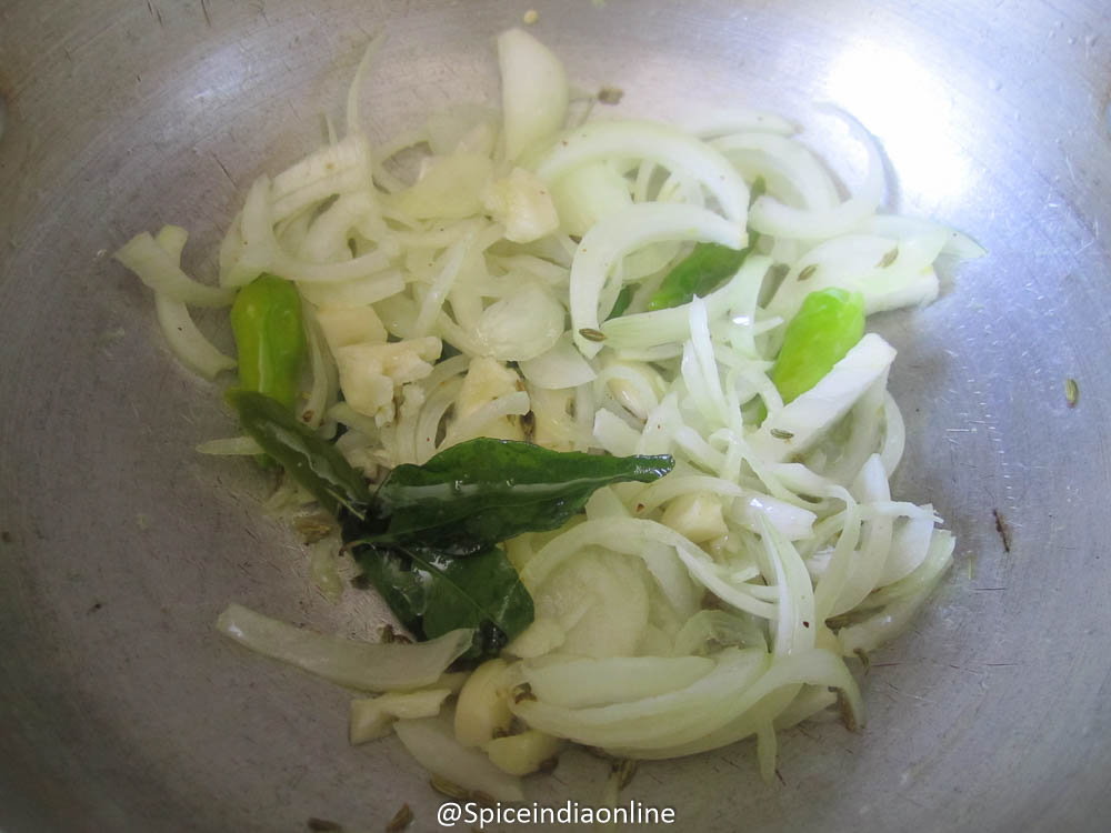 • Saute onions along with garlic and green chillies until lightly browned.