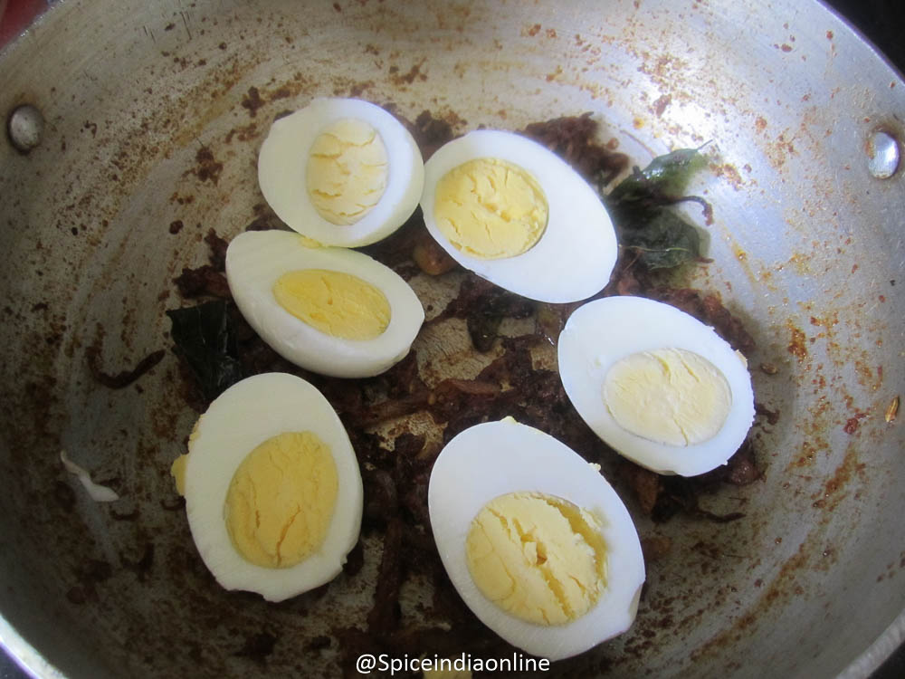 • Place half cut boiled eggs over the masala and cook for 2 minutes on either sides to coat.