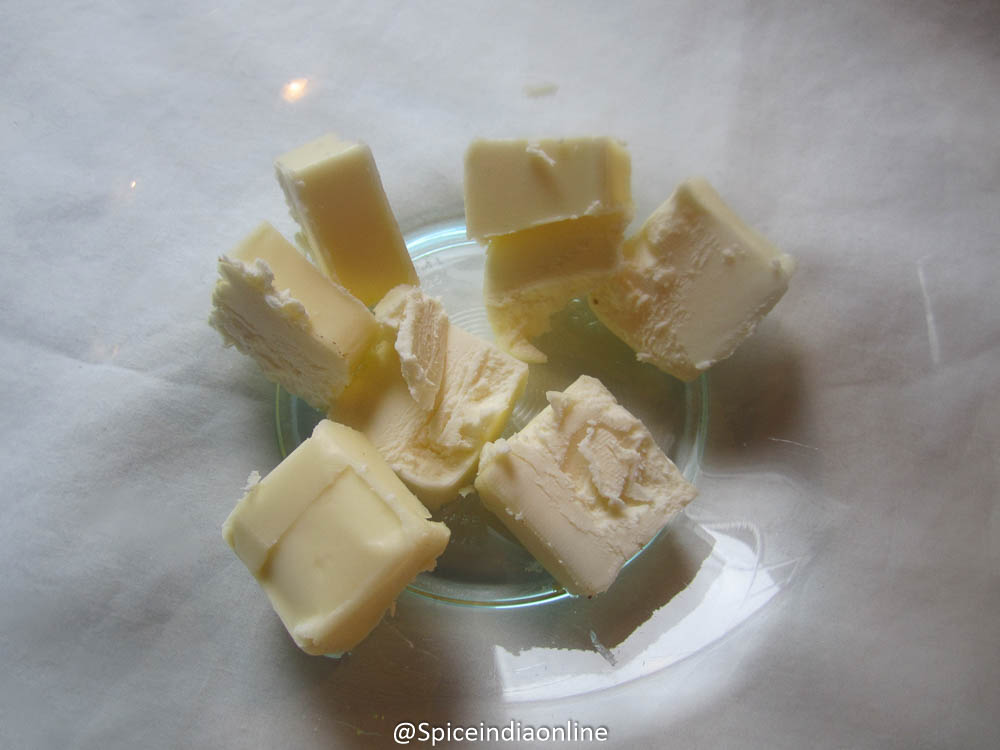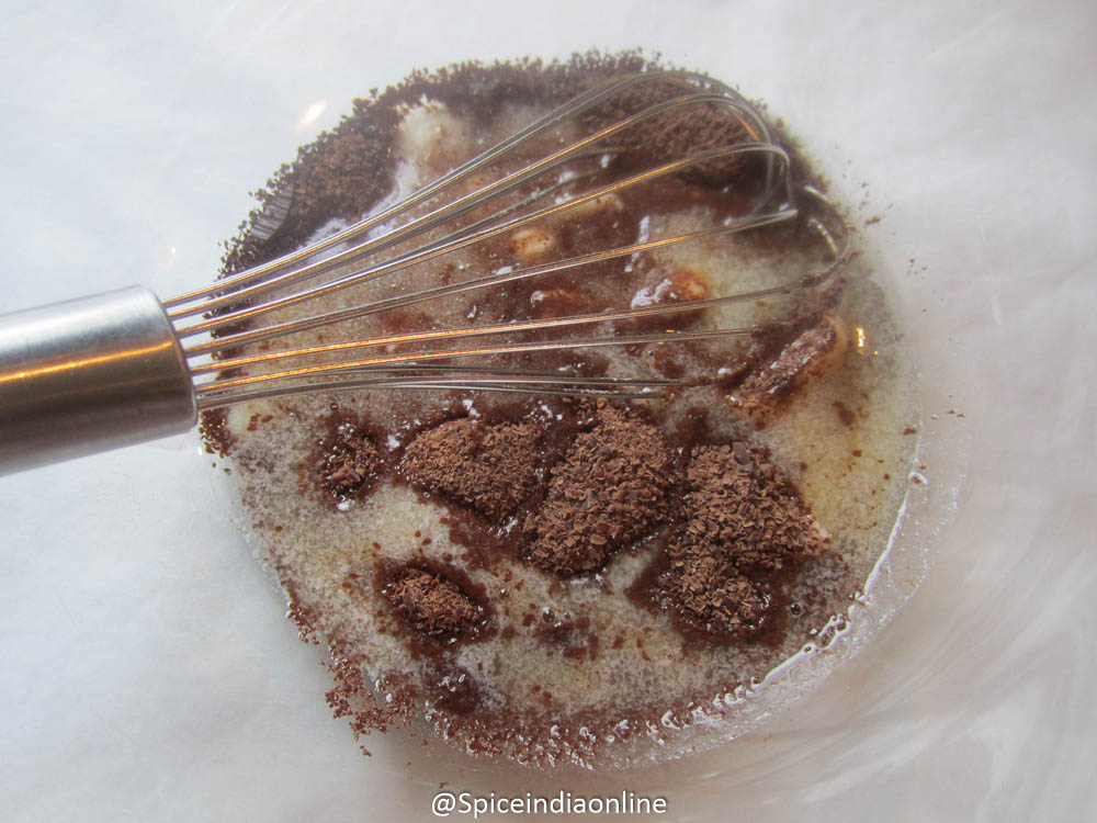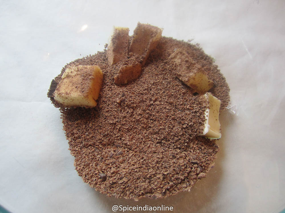 Add in choco chips or grated unsweetened chocolate. I have used dark chocolate, you may use semi sweet if you prefer a little sweet. Microwave for 30 seconds to just melt the butter & chocolate lightly or you use a double boiler to melt.