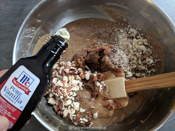 • Grind the dates to a coarse texture using food processor or chop them. Pour the milk, vanilla and oil into the dry mix and whisk to make a thick batter.