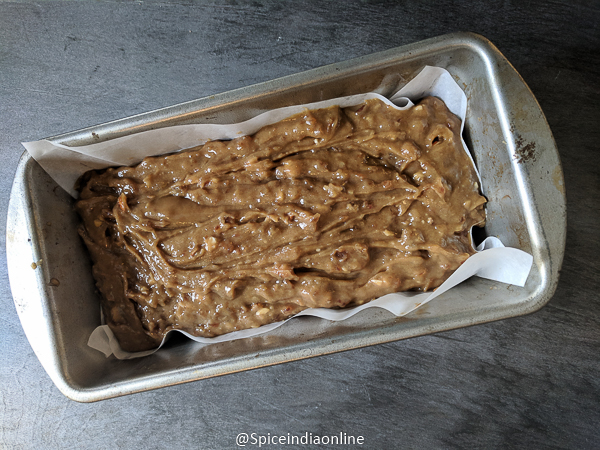 • Pour the mixture into a loaf pan lined with parchment paper.