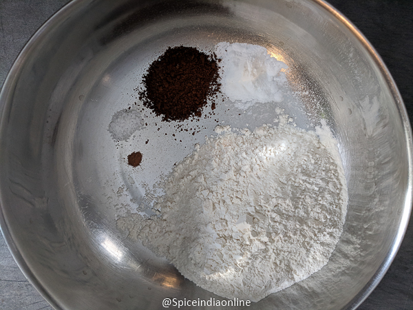 Meanwhile assemble all the dry ingredients… all purpose flour, baking soda, coffee powder, cinnamon & salt. Sieve if you prefer…