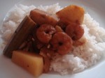 Pour the ground paste in strainer..Now add 1 1/2 cup of water to  the tamarind n tomatoes paste. add salt, dhania powder n red chilli powder with the tamarind n tomato juice , add this to the shrimp n keep the heavy flame..once its boil for the first time add the potatoes pieces to this gravy..cover n let it cook for 10 minutes…once potatoes r cooked..put off the stove.