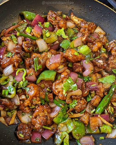Indo Chinese Fusion dish made with cauliflower. Deep fried cauliflower florets tossed with dark, soy and other stir fry sauces along with onion, chilies, garlic and ginger!
