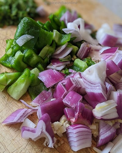 Chop Onion and Green Peppers into big dices. Quartering will work too. Slit open green chilies and finely minced garlic and ginger.