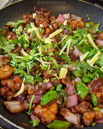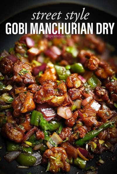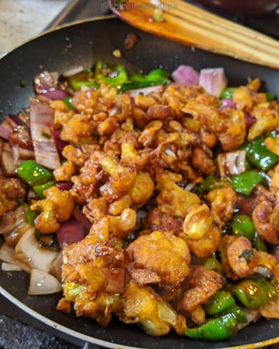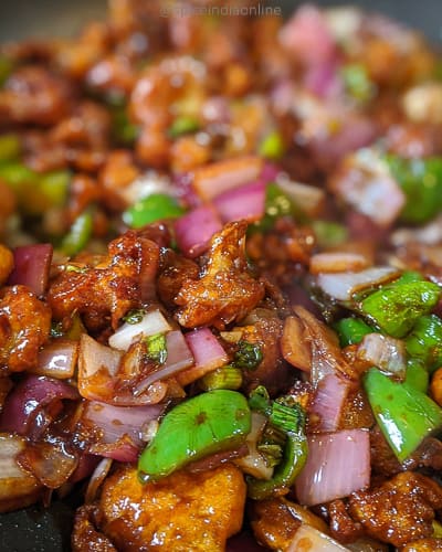 This Indo- Chinese dish is mostly made in two ways. The dry version is served as a starter and the saucy version as a side for fried rice or noodles.