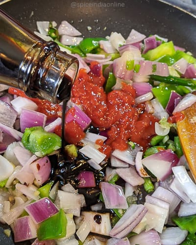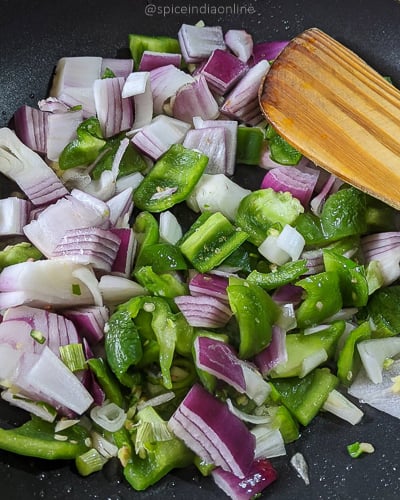 Saute onions, green capsicum, green chili, ginger & garlic until slightly tender adding sugar and salt.