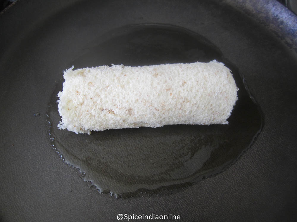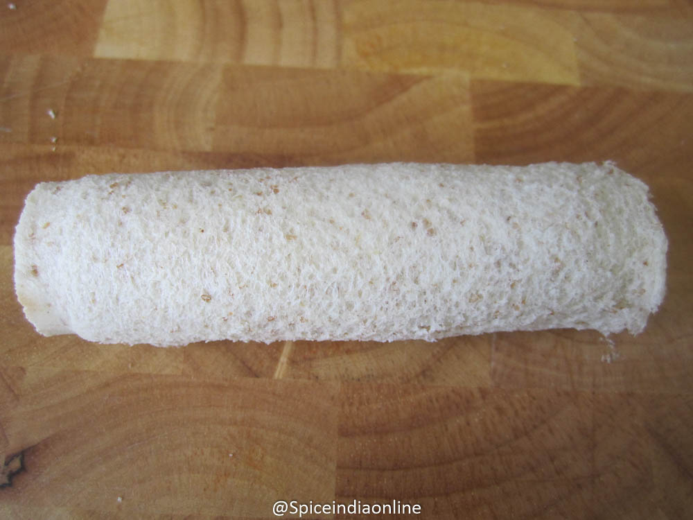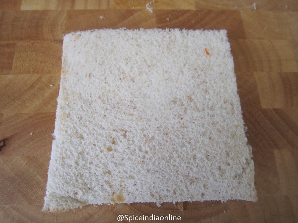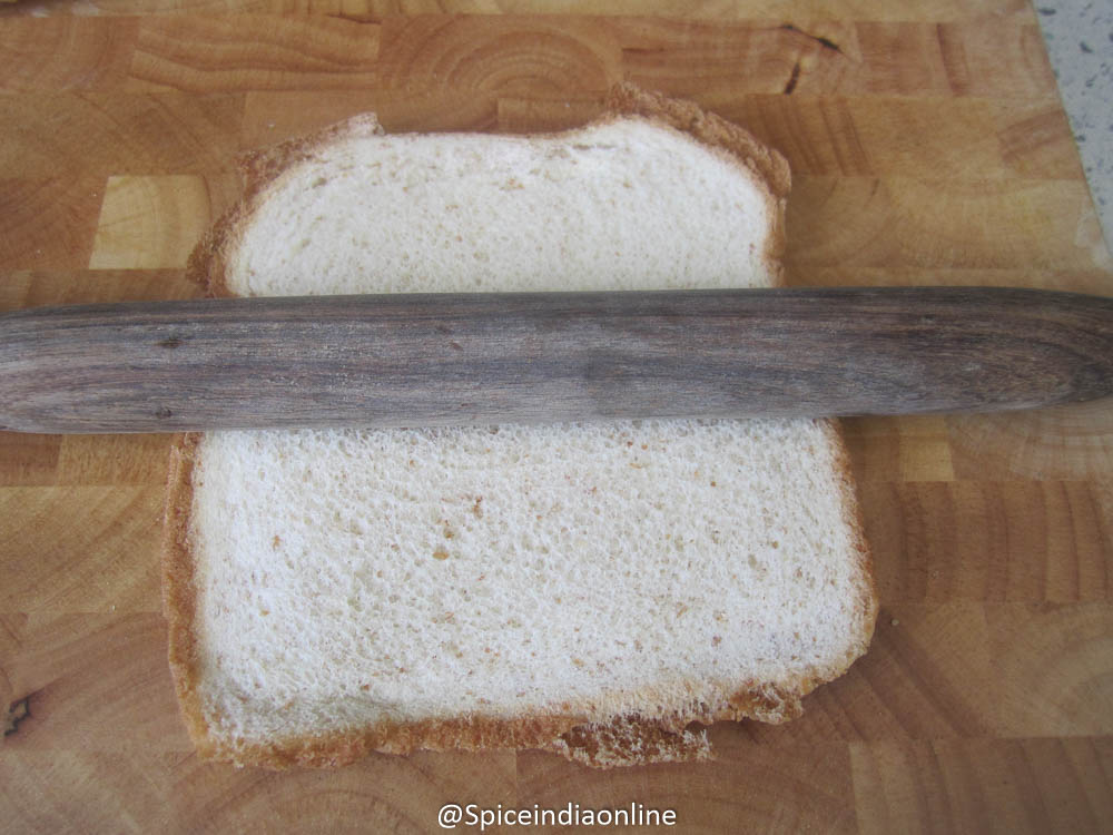 Lay out a slice of bread on a board or any flat surface. Using a rolling pin, flatten it evenly.
