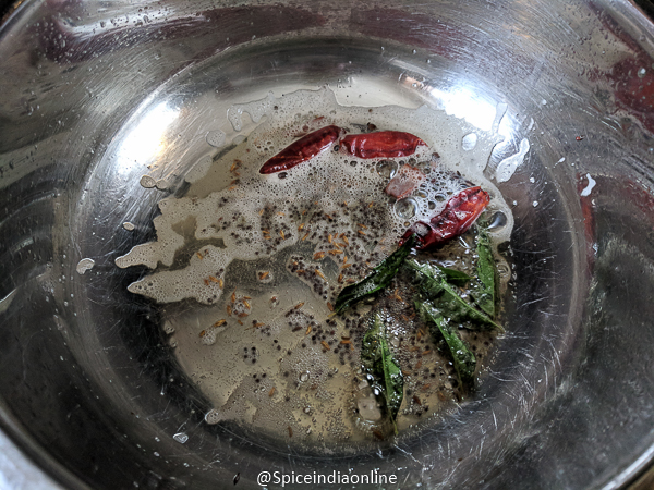 - Now heat ghee (must for this recipe) in a pan. Temper with mustard seeds, cumin seeds, dry red chili, asafoetida, cloves, cinnamon and curry leaves. Let them sizzle a bit.
