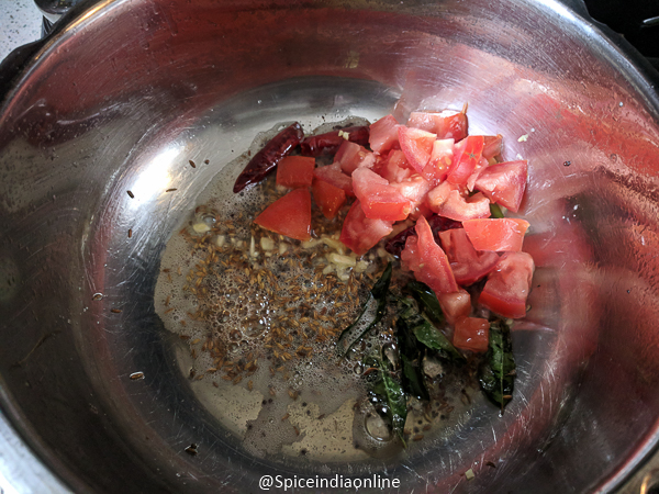 - Add in chopped tomatoes along with minced ginger along with red chili powder, turmeric powder, coriander powder, jaggery, salt and tamarind.