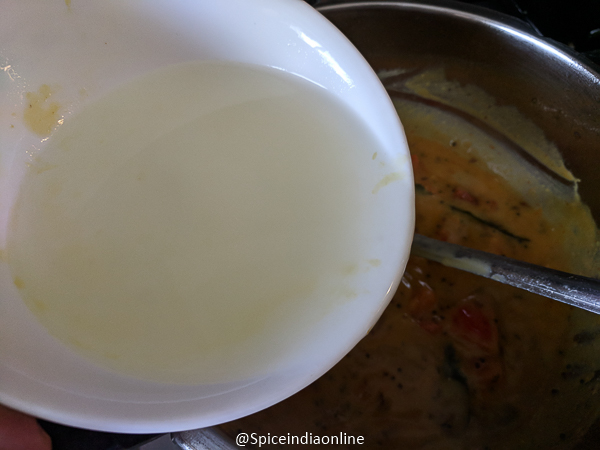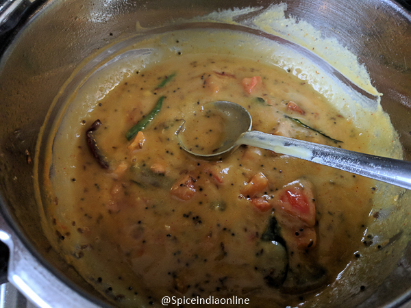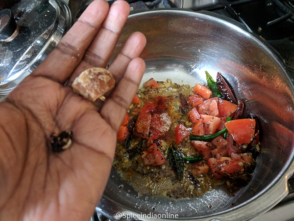 Followed by Red chili powder, turmeric powder, coriander powder, jaggery, salt and tamarind. (traditional kudam puli is used… i have used regular tamarind) Adding the tamarind directly to hot oil will make it melt and blend in. You may even skip tamarind and add more tomatoes instead for the tangy flavor!