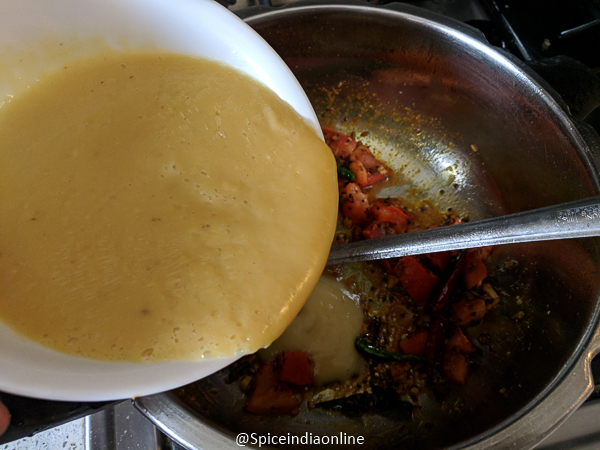 - Now add in the cooked dal blend. Cook it along with all the masala powder… it will be like a thick smooth dal at this point…almost like a paste. Add in 2 cups of water to dilute it.