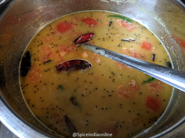 The dal will be looking very thin with all the tempering floating on top.