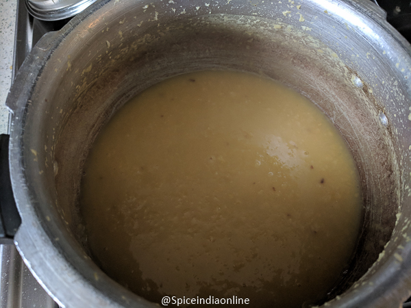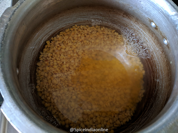 Pressure cook the soaked tood dal with 3 cups water and turmeric from table – 1 for upto 6 whistles.
