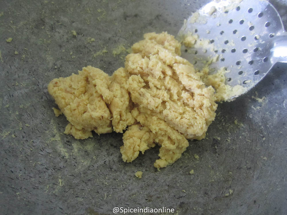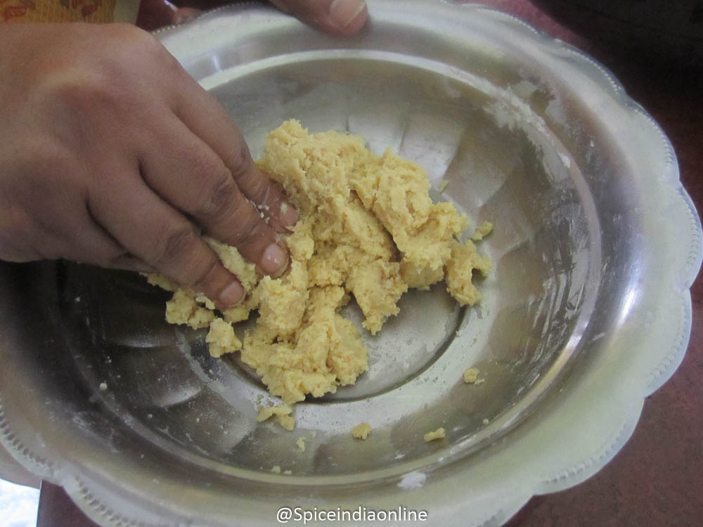 Add in kova / khoya to it and mix well. Add in maida little by little to form a soft dough. It will appear like bread crumbs initially.