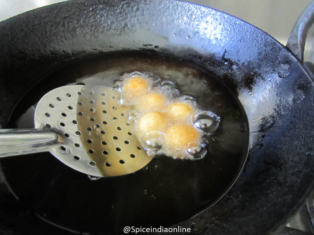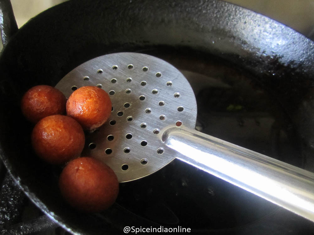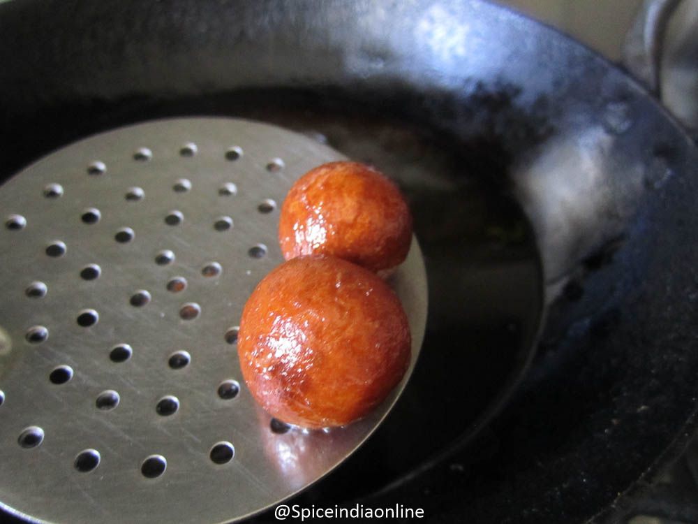 - To perfectly cook the jamun, always fry them over very low medium flame. High flame will brown the outer layer and inner dough will be be uncooked.