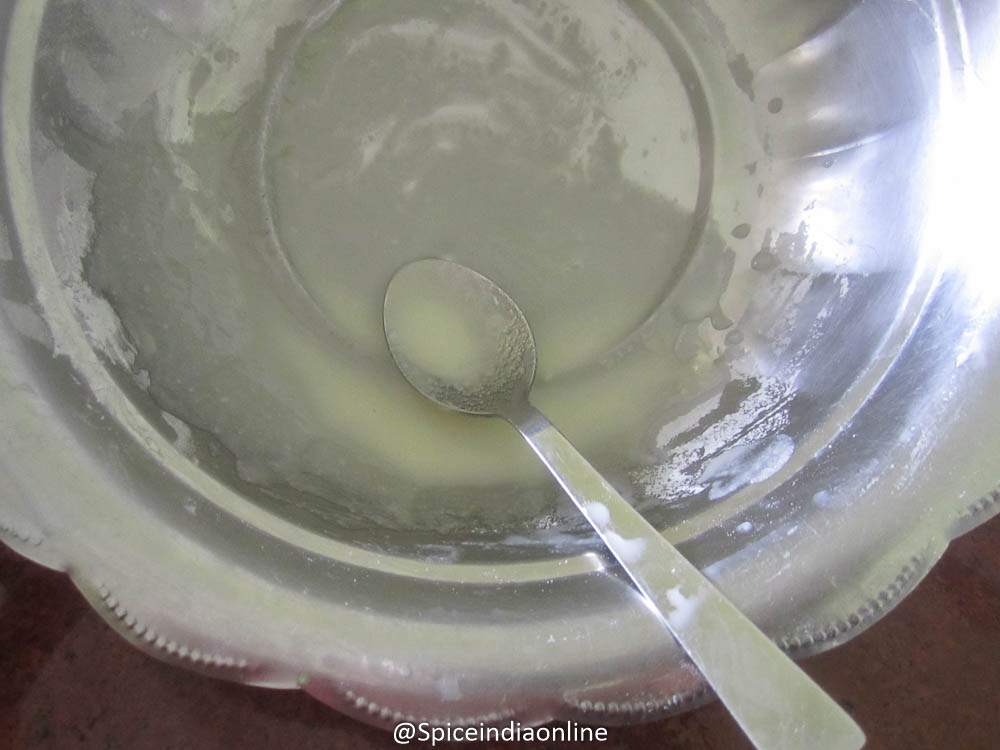 First, take 1 teaspoon ghee or vanaspati in a bowl and add cooking soda to it. Rub nicely to mix… either use your hand or mix with a spoon to make it frothy.