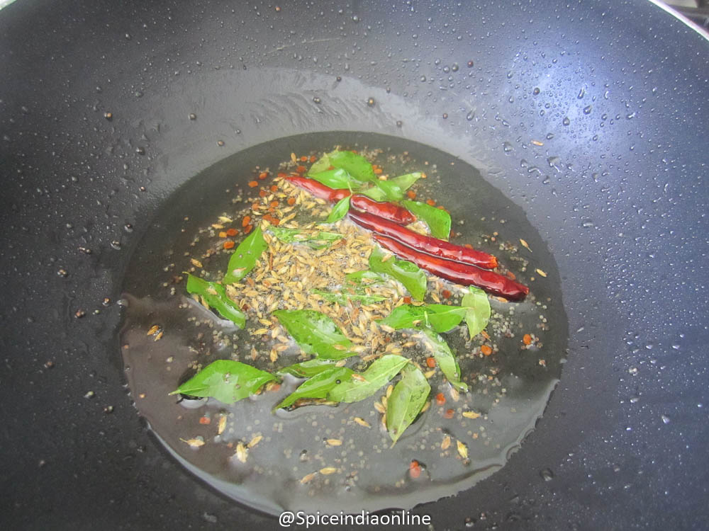 Now take a regular deep sauce pan , heat the oil and add mustard, cumin seeds, fenugreek seeds, dry red chilies, curry leaves and asafoetida, let them splutter.