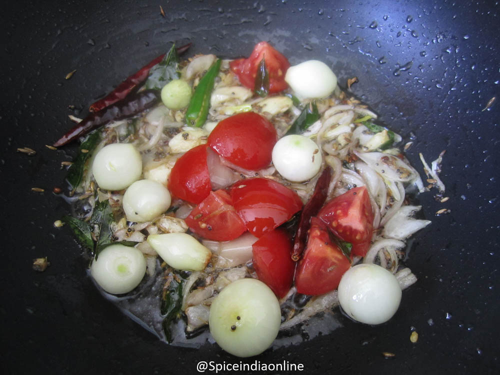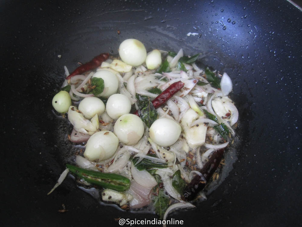 After the seasoning, add the chopped onion, sambar onions, green chilli and garlic and saute them for few minutes or until translucent.