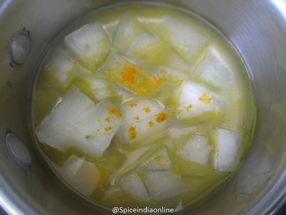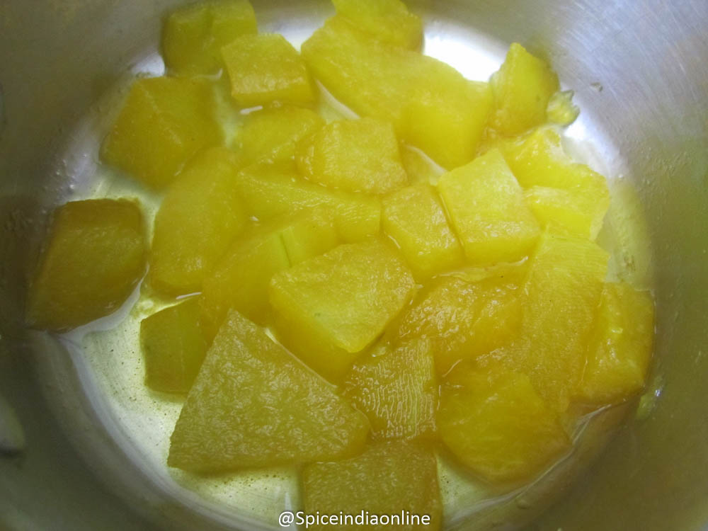 Pressure cook pumpkins separately with a dash of turmeric powder, little salt and water (Maximum 2 whistles) and set aside.