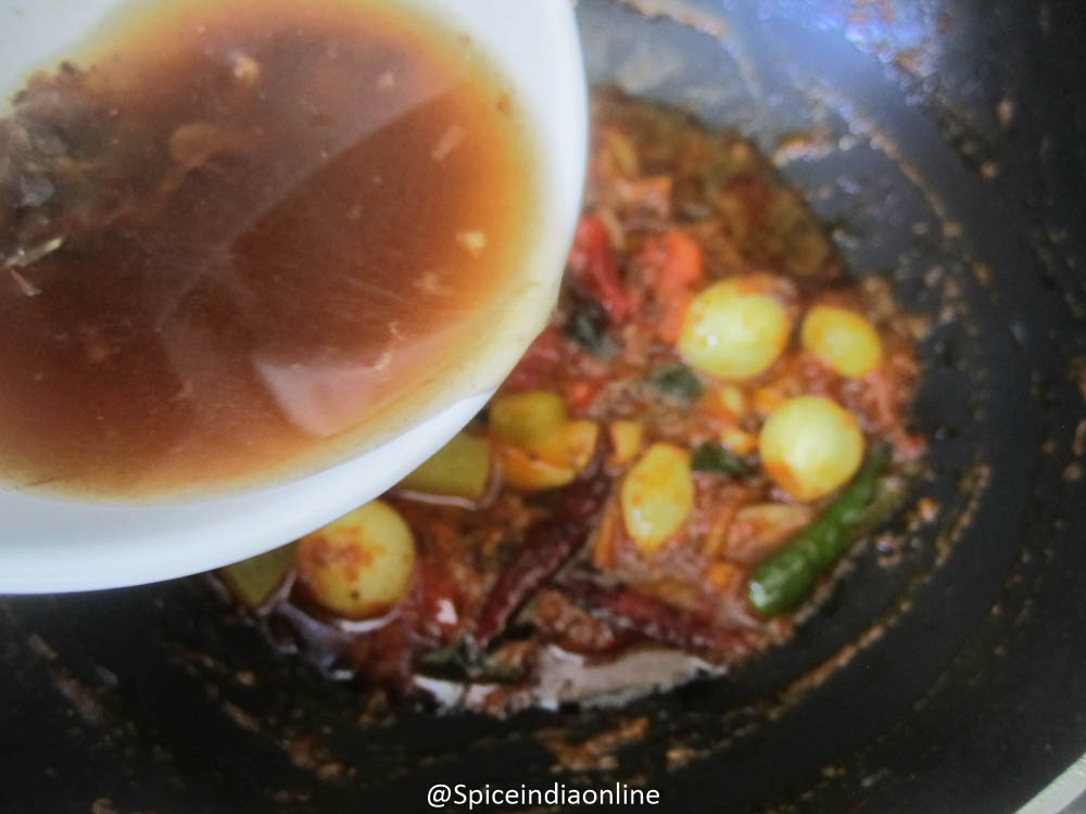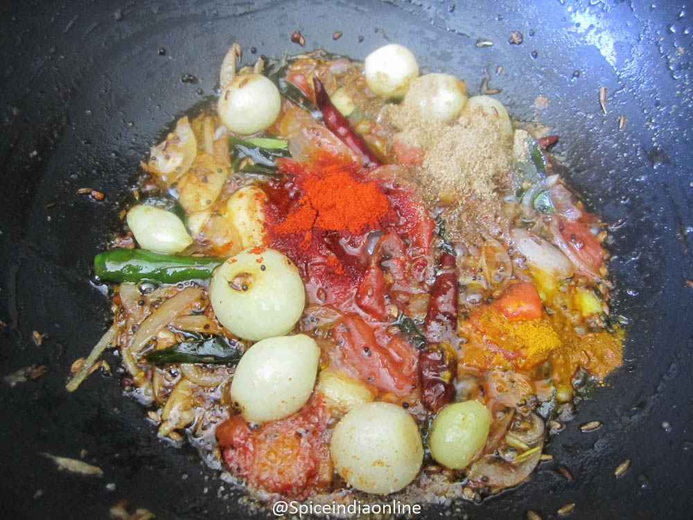 2. If your home made chili powder is too spicy, then reduce to 2 tsp for each cup. Since you are adding vellam and lots of tomato pulp, the spice level will be adjusted. Ofcourse everything has to be doubled for 2 cups.
