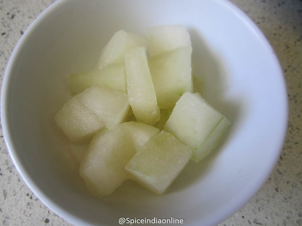 White pumpkin or vellai poosanikkai is the secret to a tasty sweet tiffin sambar. Chop them to yield about 15 small pieces.