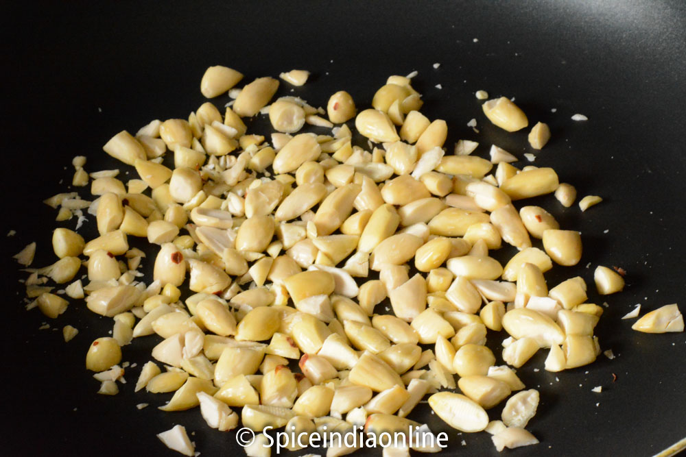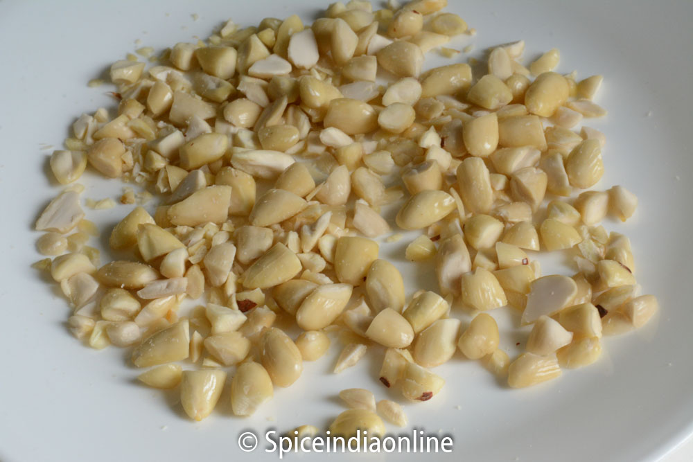 This step will stop any further cooking and also helps in removing the skin. They slide off easily. Discard the skin. Now place the blanched almonds in a clean kitchen towel and dry for at least an hour. Now you can either dehydrate using a dehydrator machine or dry them in your oven for few hours at the lowest temperature with oven door open slightly. Roughly chop – this is optional, it ensures even roasting.