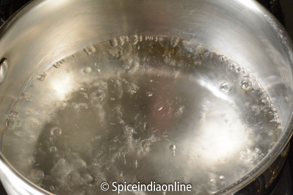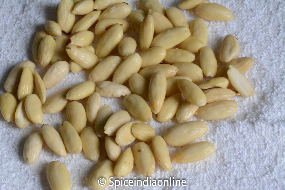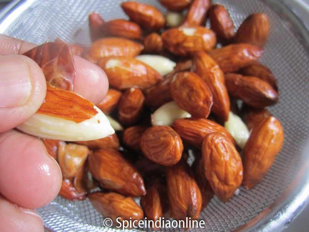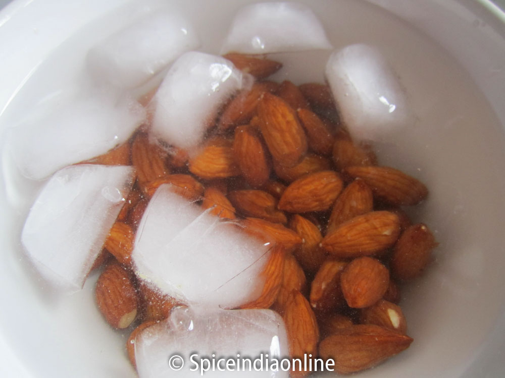 Heat enough water in a sauce pan and when it comes to a boil, switch off and pour that over the almonds. Let it sit for 3 minutes and no more than that. Immediately put them in a bowl filled with ice water to cool.