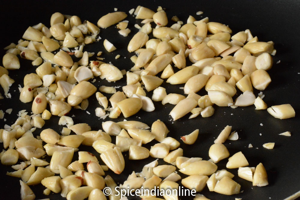 I’ve used a plain frying pan and toasted them over low flame for 20 minutes stirring every now and then. After this let them cool completely. Using a food processor / mixer / blender grind the almonds. Just use the pulse setting run a few times. Too much grinding will make the almond release oil and it will turn into almond butter.