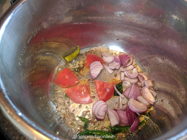 • Followed by chopped onion and tomato. Saute for few minutes.
