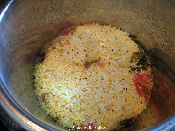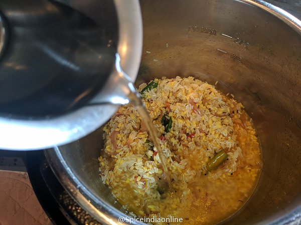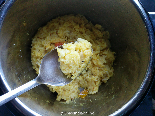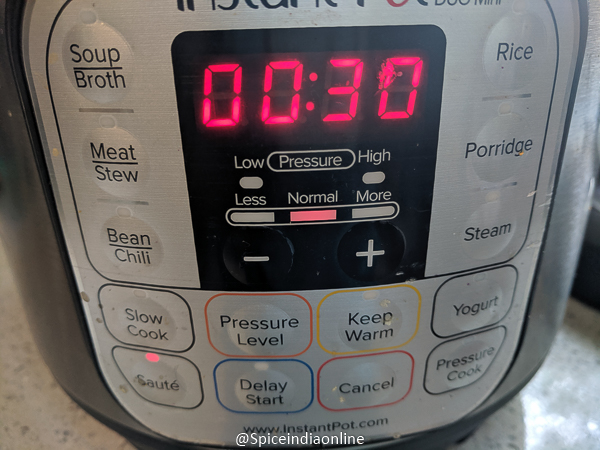Cancel saute mode and switch to pressure cook mode and set time for 15 minutes. Let the pressure release naturally if you prefer mushy consistency or release pressure manually for a firm texture.