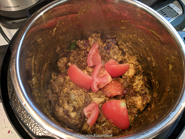 • Add in the Pepper Chicken Masala Powder and saute well until the mixture turns dark brown in color. Add in the chopped tomatoes and saute lightly.