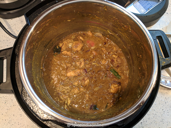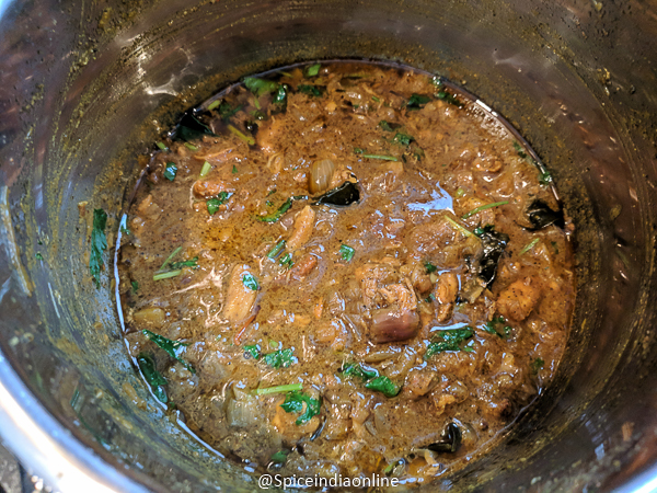 The curry turns to intense dark brown color separating oil over the top. The chicken will be cooked to tender… almost falling apart texture.