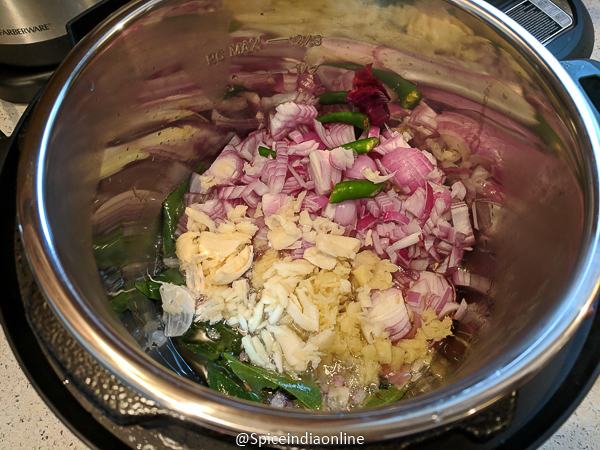 • Saute onions, green chillies, ginger and garlic until lightly browned.