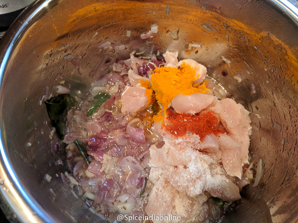 • Add in the chicken along with turmeric powder, red chili powder and salt. Saute for few minutes.