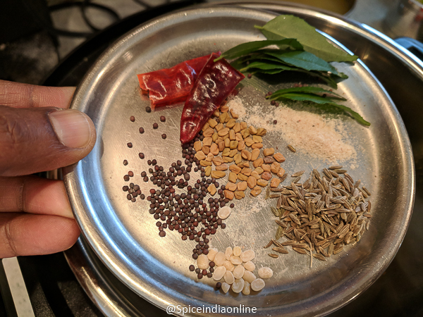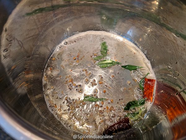 • Temper with dry red chilies, mustard seeds, fenugreek seeds, split black gram, cumin seeds, asafoetida and some curry leaves.