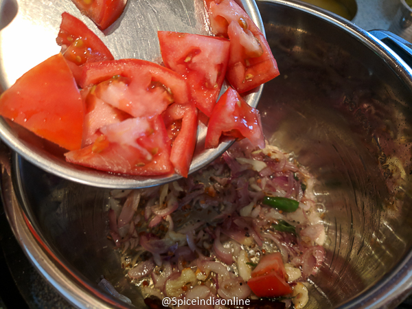 • Saute shallots with green chilies for few minutes and then add tomatoes. Cook until it turns soft.