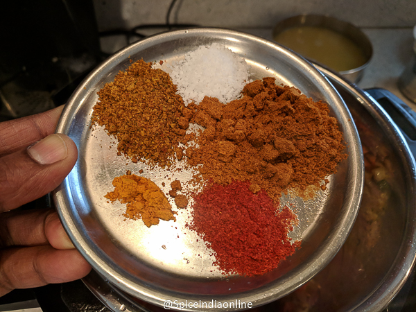 • Now add turmeric powder, red chilli powder, coriander powder, sambar powder and salt. Saute till the raw smell goes.
