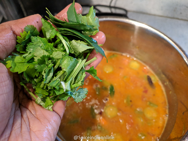 When your sambar start to boil throw in chopped coriander and curry leaves
