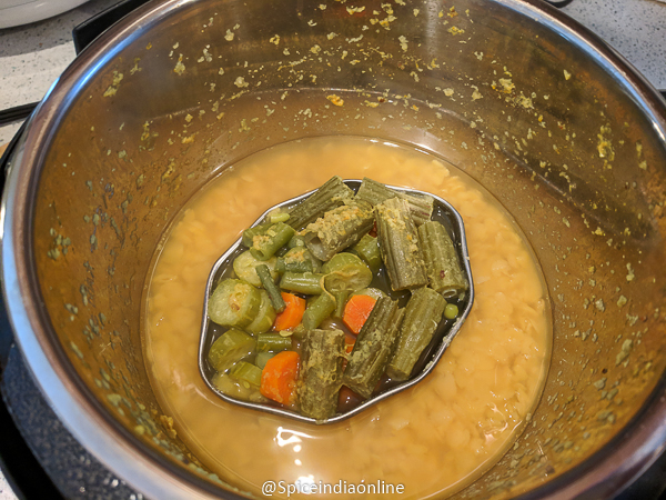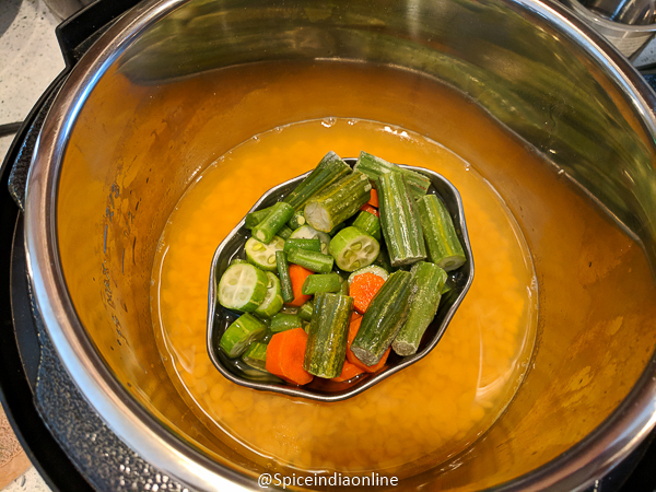 • Place a trivet or steaming rack for the veggies. Take the mixed veggies in a steel insert pan or any regular pan that fits in the pot. Place it over the trivet.