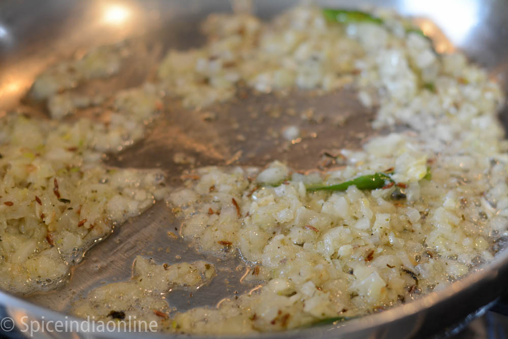 Heat oil and butter in a kadai/Wok or if you can’t find one, just use a regular frying pan.  Add cumin seeds and once it sizzles add the onions and green chilies along with crushed dry fenugreek leaves and let cook until it turns translucent.