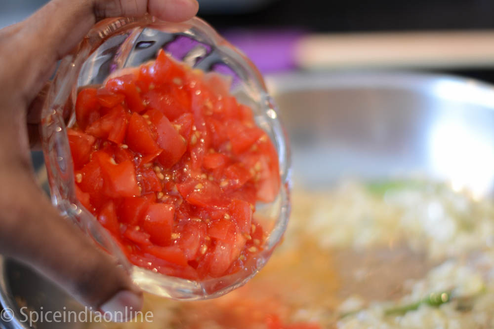 Once its starts to brown add the ginger garlic paste, followed by crushed tomatoes. Let the tomatoes cook for about 5 minutes over low flame or until it turns mushy.