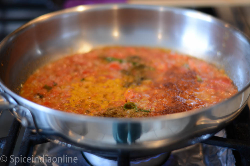 Now add the turmeric powder, Red chili powder,coriander powder and salt.  Add water and let the masala cook a little bit.